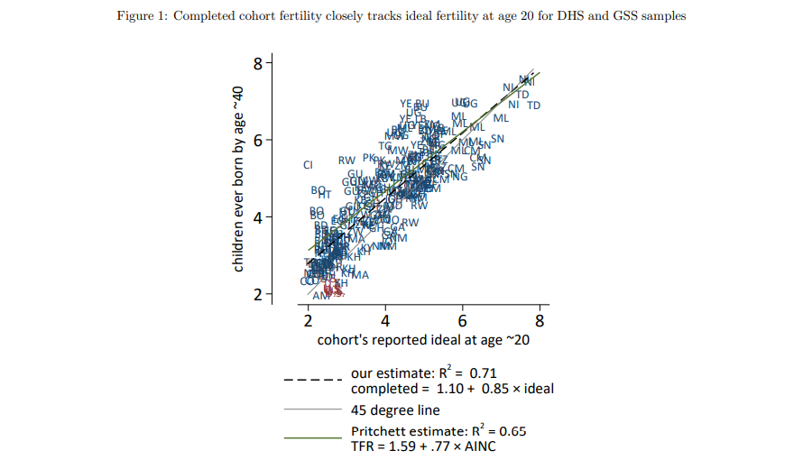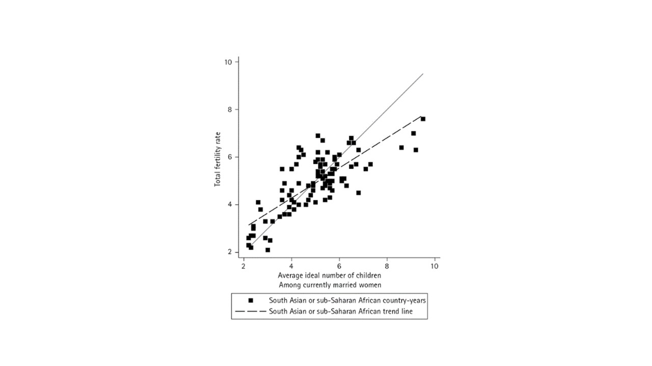 Pritchett (1994) influentially examined the relationship between survey-reported ideal fertility and period total fertility rates. Pritchett’s analyses found that country-period by country-period differences in fertility preferences could statistically account for the majority of the variation in period total fertility rates. This result was impactful because it suggested that preferences, rather than constraints such as contraceptive access, explain fertility outcomes.