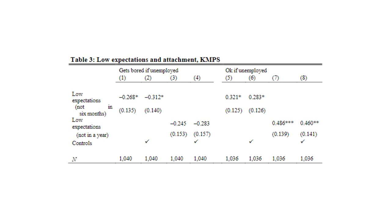 We find evidence of reference-dependent decision-making in labor supply decision-making in two datasets about a high-unemployment part of Cape Town, South Africa, including a panel. People with low expectations for finding a job – that is, people who expect to be unemployed – are less likely to report accepting several hypothetical job offers.
