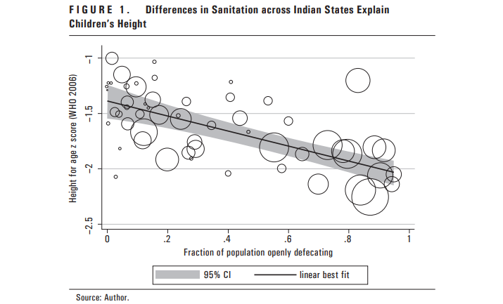Children in West Bengal and Bangladesh are presumed to share the same distribution of genetic height potential. This gap can be fully accounted for by differences in open defecation, and especially by open defecation in combination with differences in women’s status and maternal nutrition.
