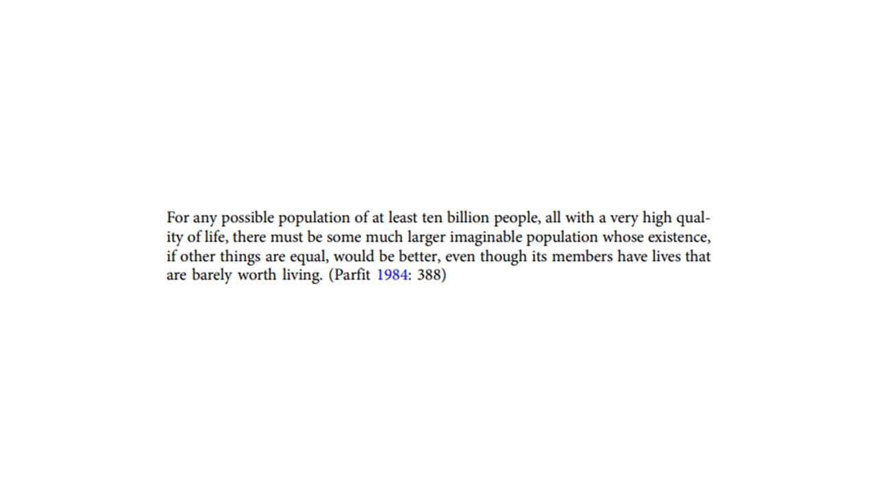 The Repugnant Conclusion is an implication of some approaches to population ethics. It states, in Derek Parfit's original formulation, for any possible population of at least ten billion people, all with a very high quality of life, there must be some much larger imaginable population whose existence, if other things are equal, would be better, even though its members have lives that are barely worth living.